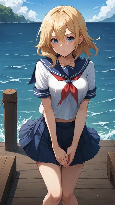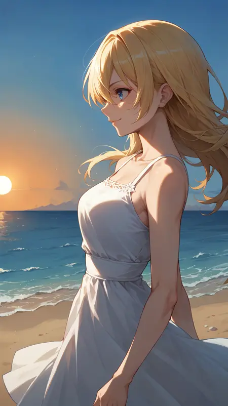 medium hair, long hair, blonde hair, hair between eyes, blue eyes, white dress, strapped dress, sleeveless,