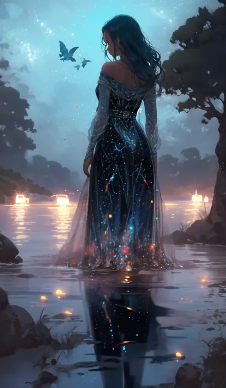 This model can generate a strange landscape, with women wearing sequins wading through shallow water, and shrubs under a backlighting rain, with a far-off city shining in the silence.