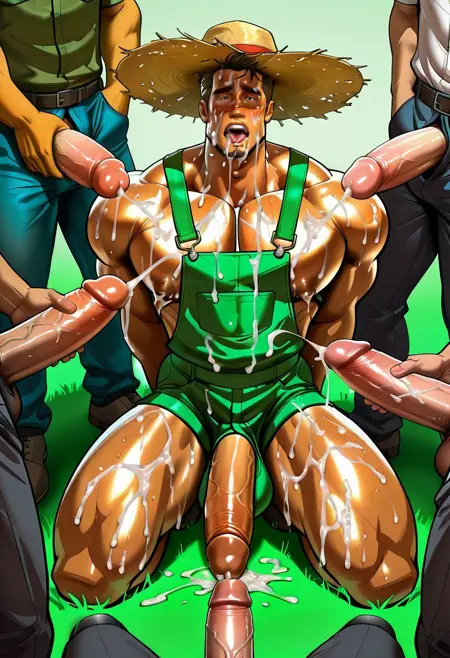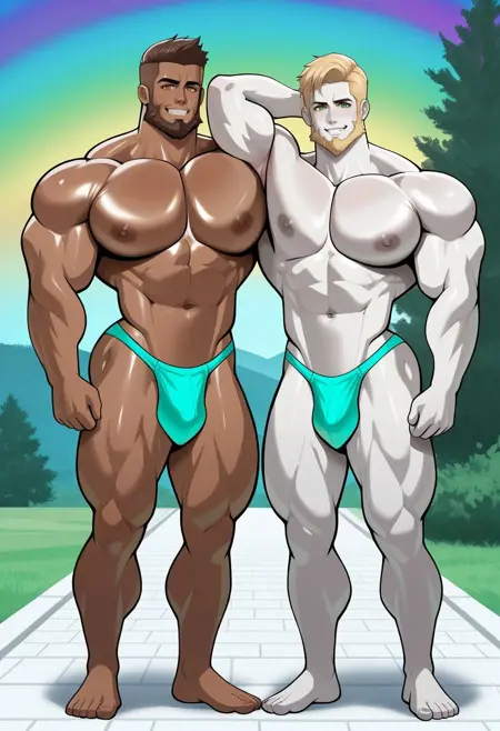 非常に筋肉質な男性を生成するAbsolutbleuのゲイアートスタイル。大きな胸板、お尻、太ももと細い腰。