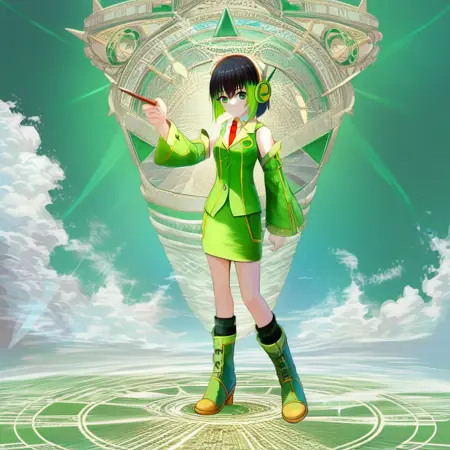Outfit - white shirt, green jacket, red necktie, green skirt, pencil skirt, detached sleeves, thighs, green boots