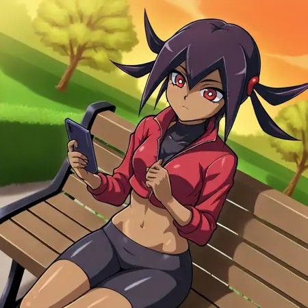 以下のタグを使って試してみてください:暗い肌、暗い肌の女性、短い髪、ピクシー髪、黒髪、両側を上げた髪、短い前髪、目の間の髪、赤い目、黒いレオタード、黒いハイソックス、爪、ドラゴンマスク、翼、尾、擬人化、コスプレ