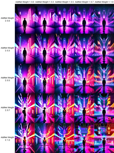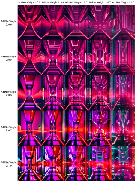 사이버스페이스 배경 키트는 매혹적인 사이버스페이스 배경을 생성하기 위해 설계된 두 개의 강력한 LoRA 모델을 포함합니다.