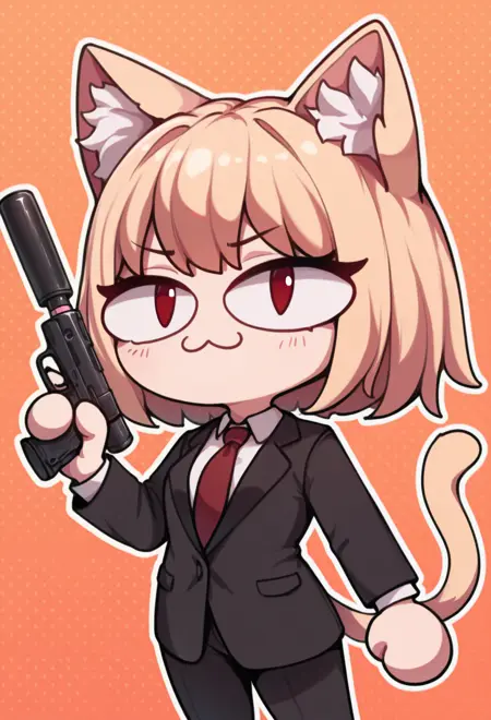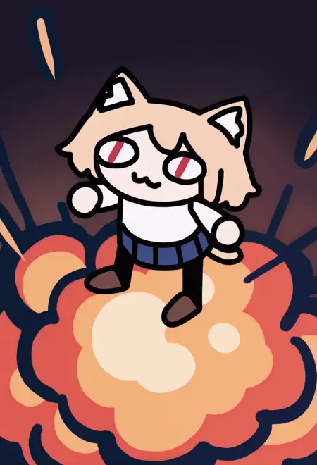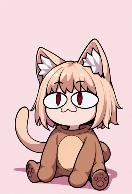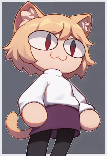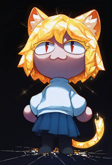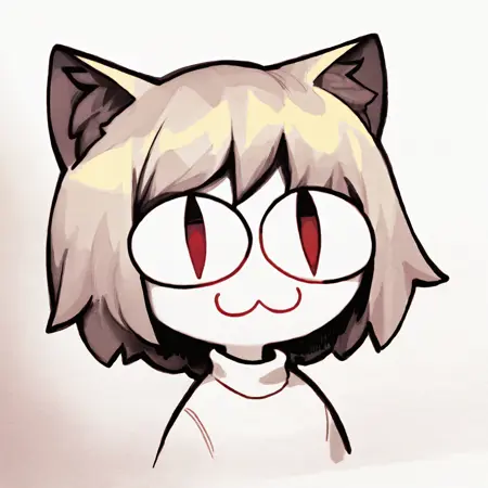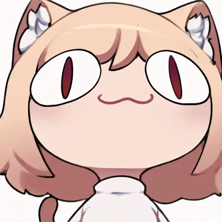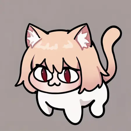 キャラクタータグ:動物の耳、短い髪、金髪、:3、猫娘、猫の尾、赤い目、縦に細長い瞳、チビ、動物の耳のふわふわ