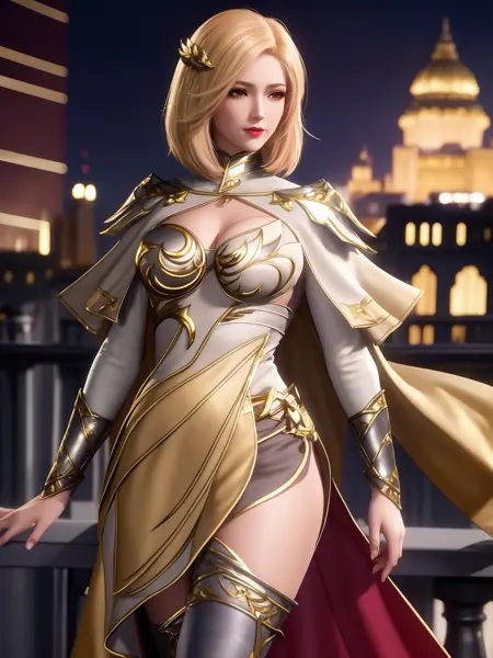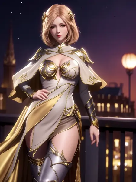 - 1girl, mature female, looking at viewer, cityscape, night,armor,hair ornament, thigh boots, asymmetrical clothes,short capelet,gold trim,multicolored dress,