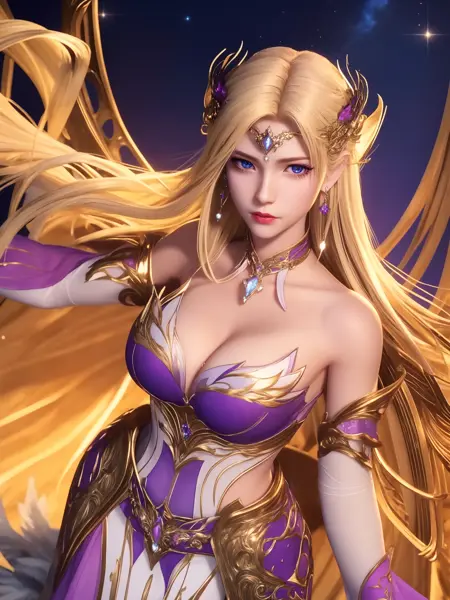 - 1girl,mature female,looking at viewer,cityscape,night,hair ornament,armor,bare shoulders,jewelry,earrings,cleavage,metal collar, forehead jewel, multicolored dress, purple dress,blue eyes,white feathers, blonde hair, sitting, throne, from below,thigh boots, armored boots,