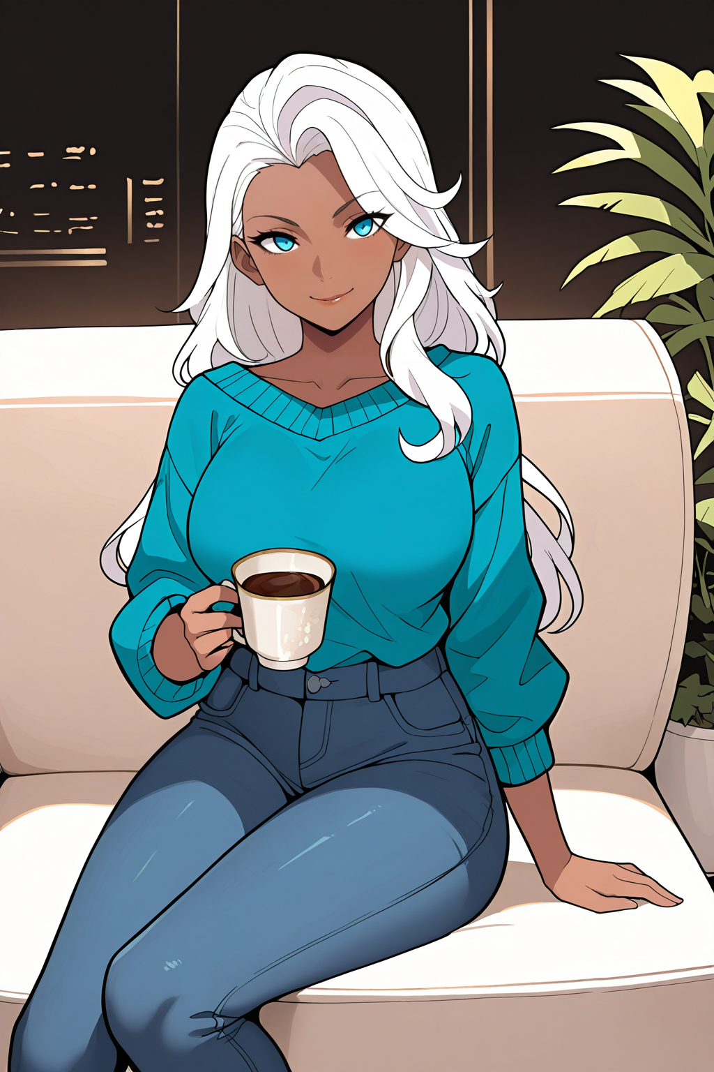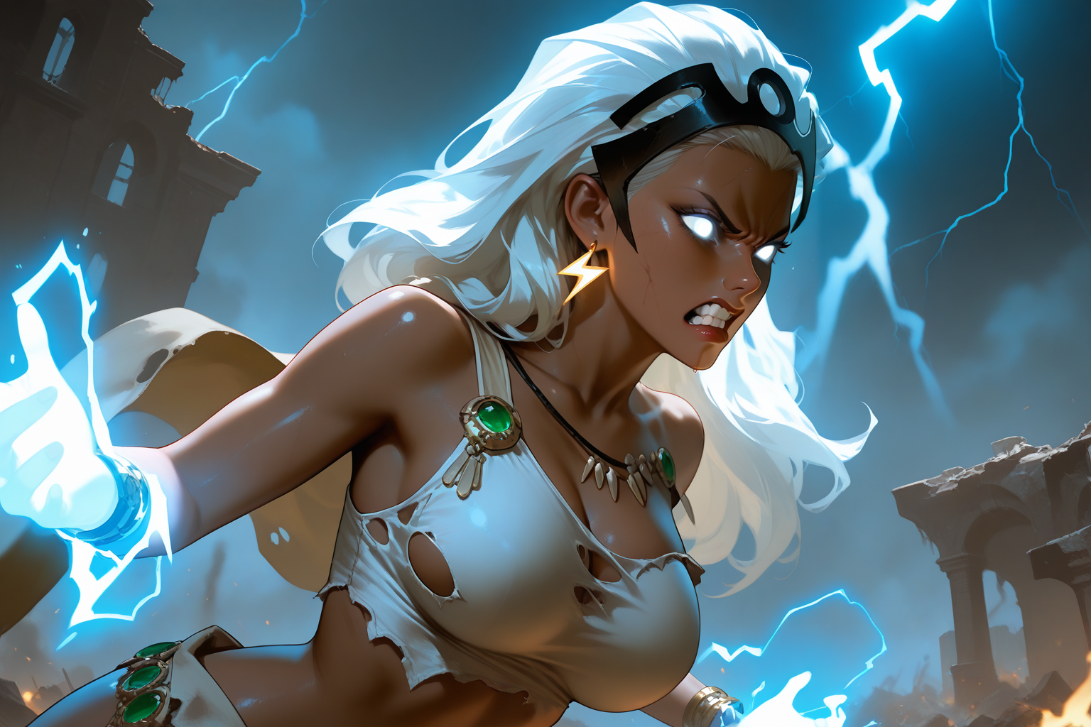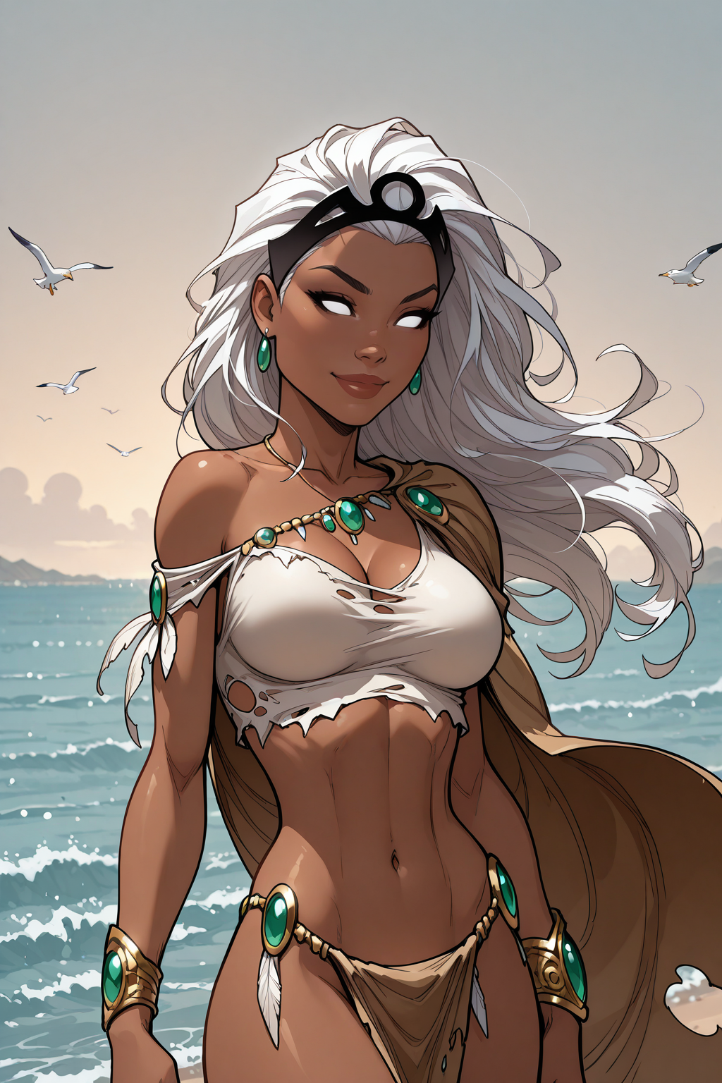 触发词:svgestorm,深色皮肤女性,长发,白发,(头饰),闪电耳环,无瞳孔,破烂衣物,斗篷,单肩裸露,项链,短上衣,胸部暴露,宝石,手镯,腰布,羽毛,靴子