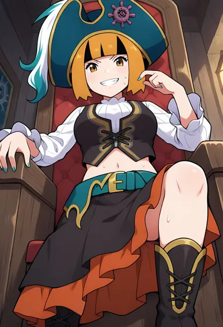 pirate hat, blue headwear, hat feather, pirate, white shirt, long sleevees, blue nails, vest, midriff, navel, belt, skirt, high heel boots, knee boots, black footwear