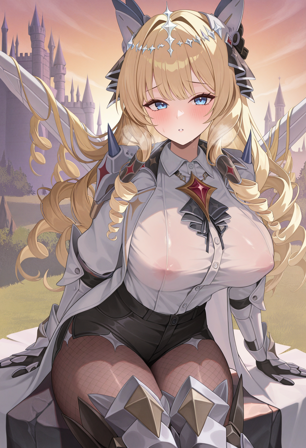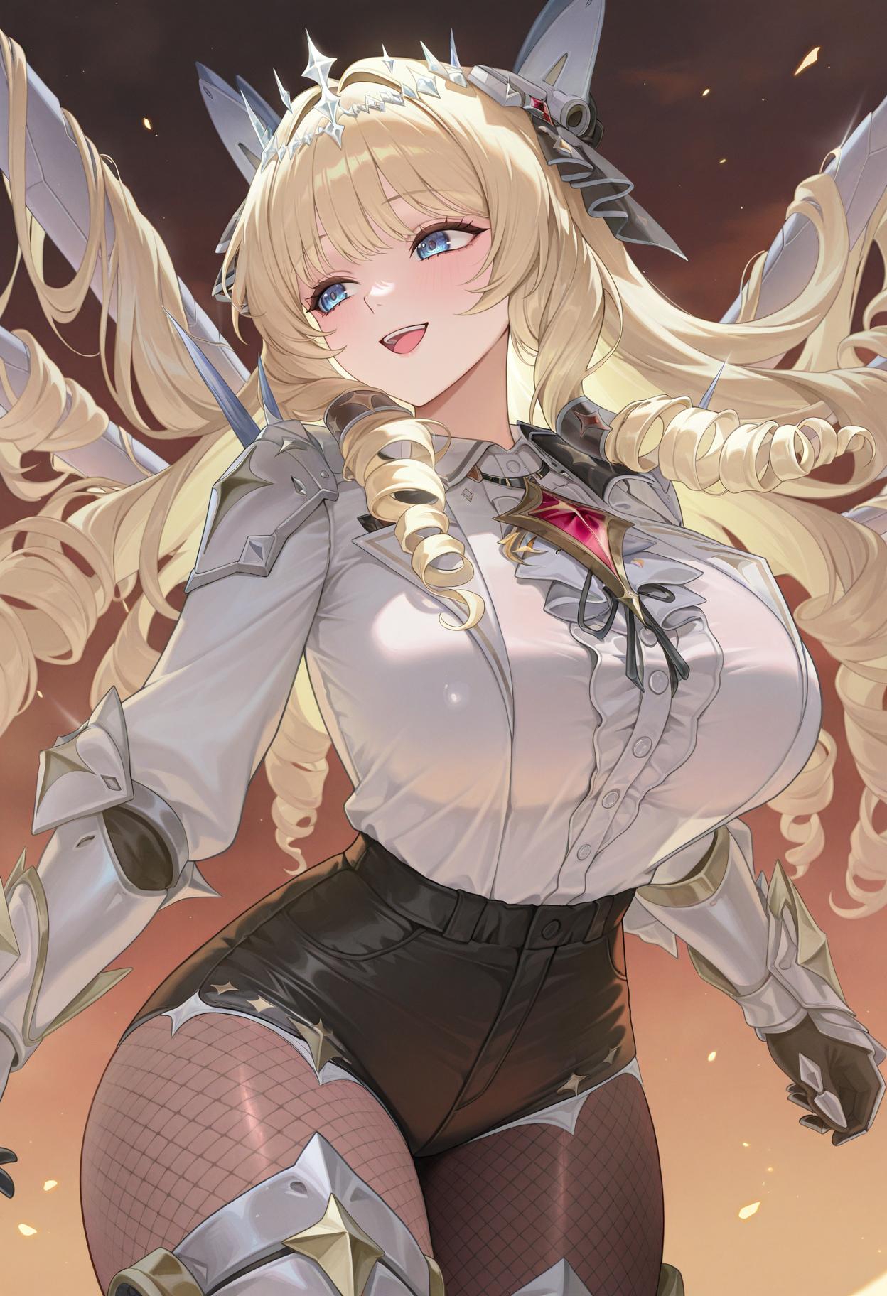 crwndf, 파란 눈, 금발, 긴 머리, 드릴 머리, 드릴 옆머리, 관모, 머리 장식, 헤어 액세서리, 큰 가슴, 흰 재킷, 흰 셔츠, 브로치, 중앙 프릴, 검은 반바지, 허리 높은 반바지, 장갑, 검은 장갑, 기계 날개, 어깨 방어구, 파이널 팬티스타킹, 스타킹, 허벅지, 장갑 부츠, 검은 부츠