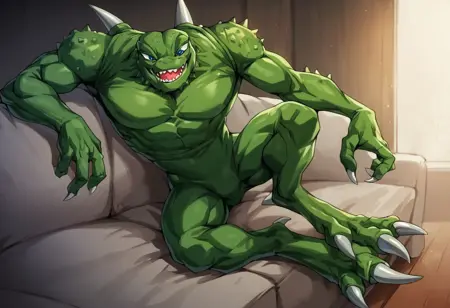 TAGS: claws, three fingers, two toes, muscular (optional), sharp teeth, purple tongue (optional), open mouth (optional), tail