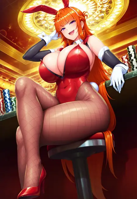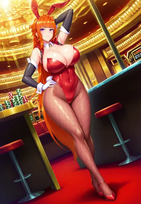 3번째 옷차림: 플레이보이 바니, 노출된 옷차림, 가짜 빨간 토끼 귀, 피셔넷 스타킹, 빨간 하이레그 레오파드, 분리형 목줄, 가슴 노출, 분리형 소매, 어깨 노출, 흰 장갑, 검은 팔꿈치 장갑, 배꼽 가림, 가짜 토끼 꼬리, 빨간 하이힐,