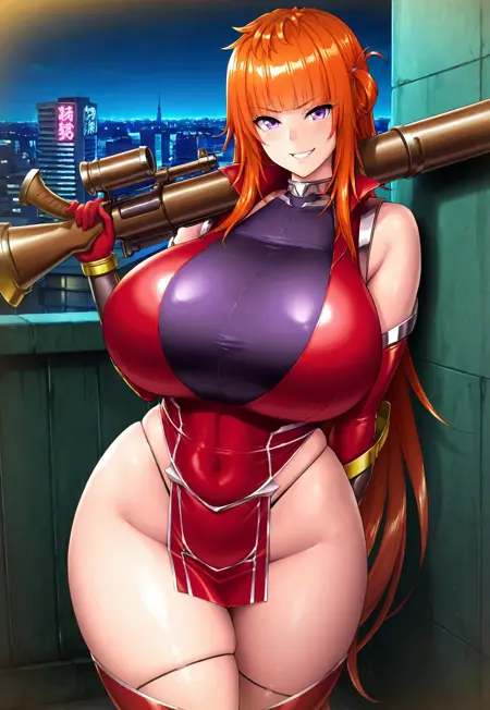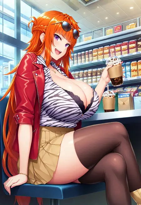 태그: 카미무라 마이카, 긴 머리, 둔한 앞머리, 주황색 머리, 옆머리, 보라색 눈, 곡선형 몸매, 거대한 가슴, 넓은 골반,