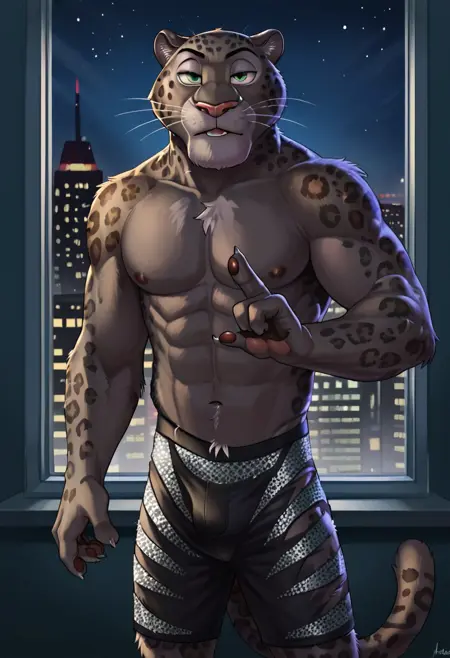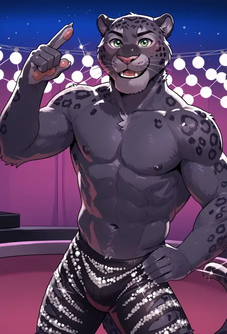 Negatives- purple lighting, facing viewer, arm behind head, black stripes on body, human male, brown background, orange body, hand behind head, arm straight out, purple background, simple background, looking to the left side, muscular body, lower angle, lower body, blurry background, blurry foreground, white background, blue shorts, arms up, arm up, hand up, shocked, surprised, toothy grin, looking at viewer