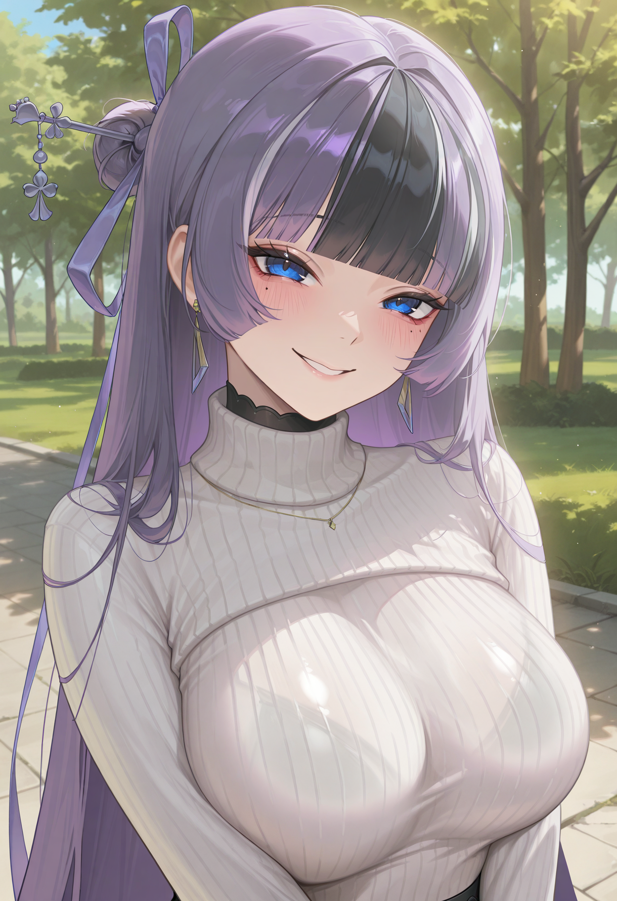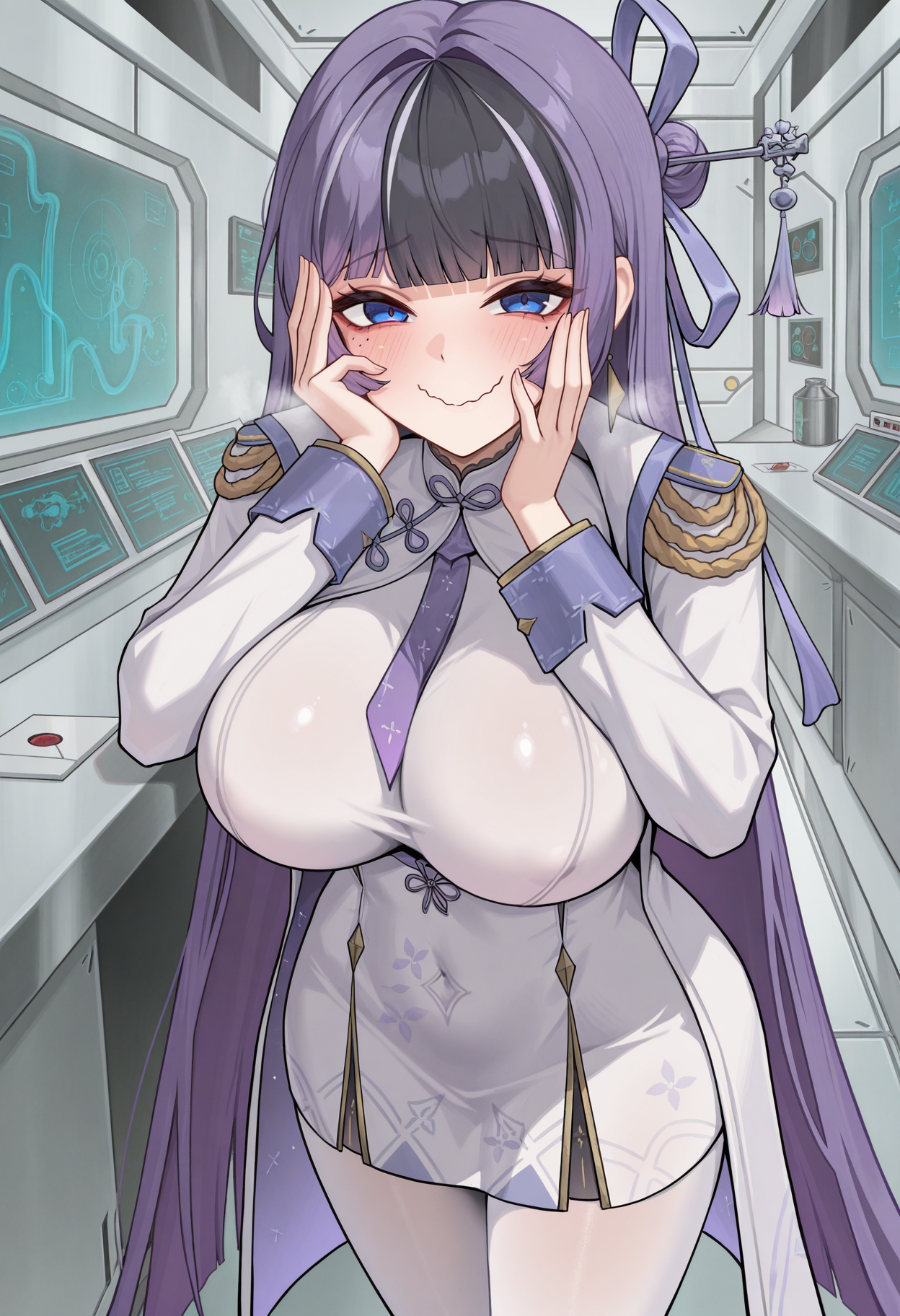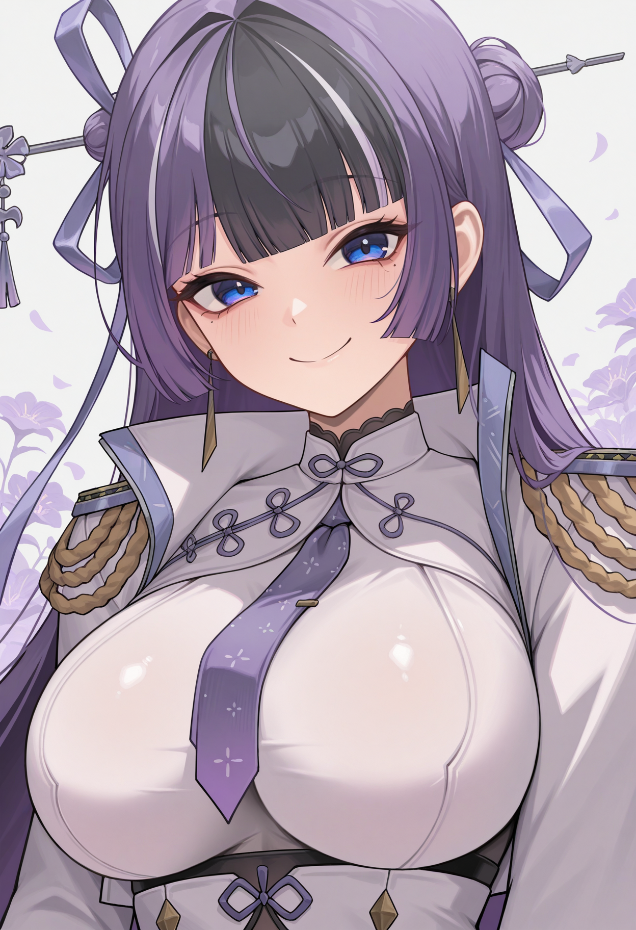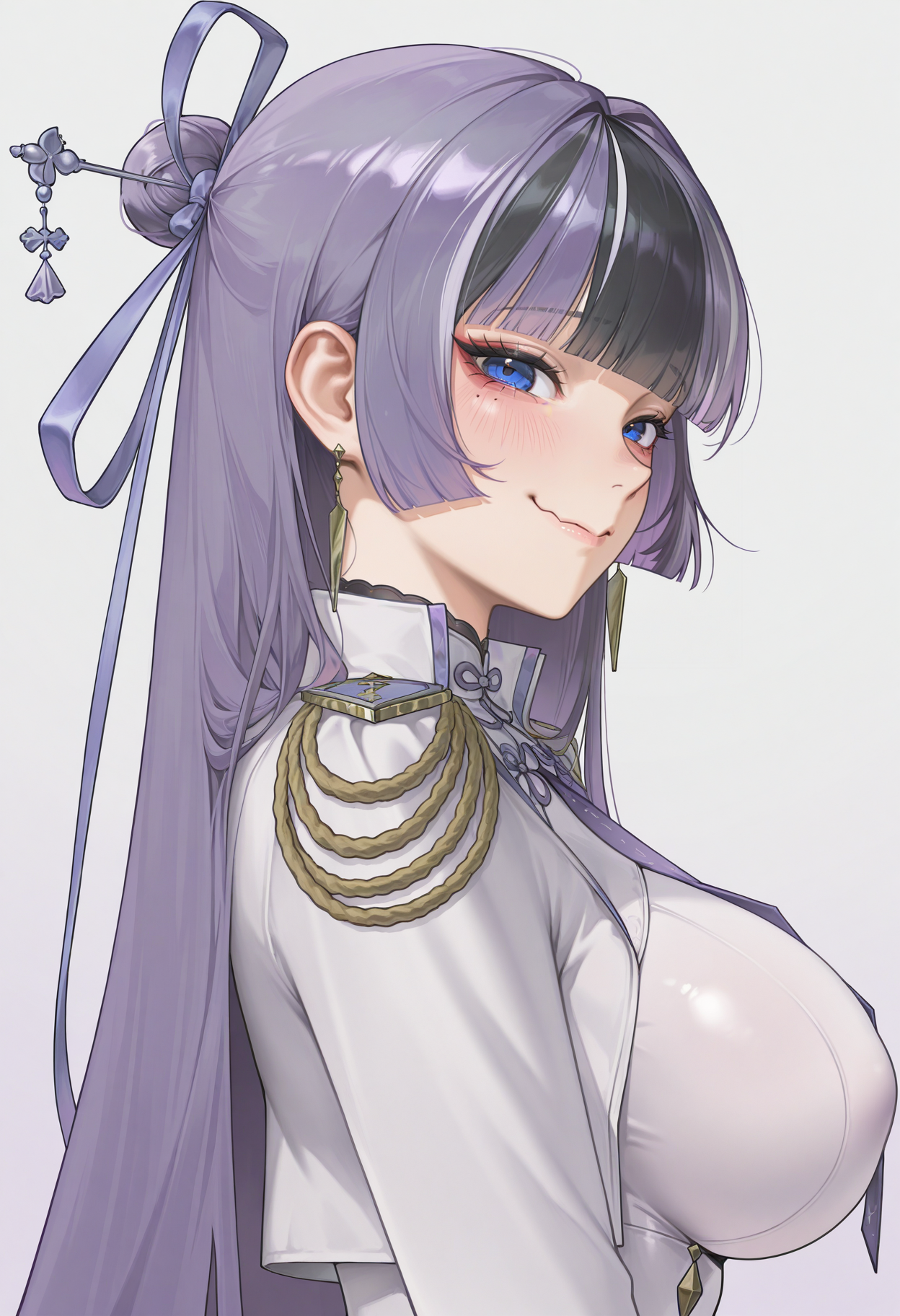 jien, 파란 눈, 눈 아래 점, 보라색 머리, 다색 머리, 줄무늬 머리, 검은 머리, 매우 긴 머리, 둔한 앞머리, 머리 뭉치, 머리 장식, 보라색 리본, 머리 리본, 귀걸이, 큰 가슴, 흰 자켓, 어깨장식, 흰 드레스, 보라색 넥타이, 불가능한 옷, 흰 팬티스타킹