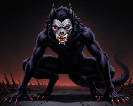 shdwbst, no humans, solo, after, red eyes, hairless face, grey face, open mouth, fangs, sharp teeth, claws, black fur, digitigrade