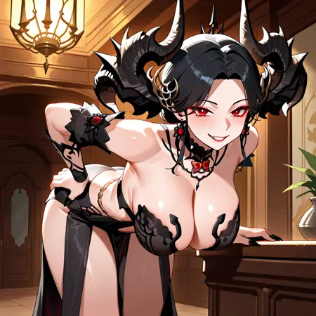 LostArk_Ec, 1girl, solo, black hair, red eyes, earrings, sharp fingernails, horns, makeup, large breasts, cleavage, jewelry, detached sleeves, black dress, revealing clothes, bare shoulders, bare legs, thighs, black footwear, high heels