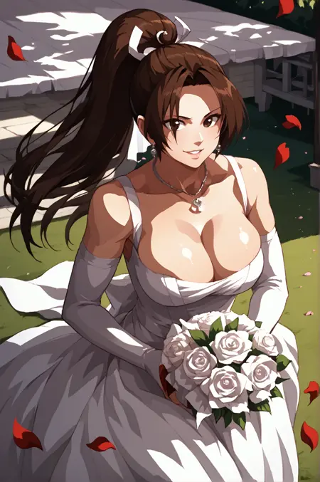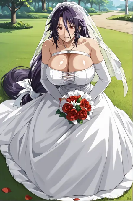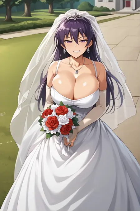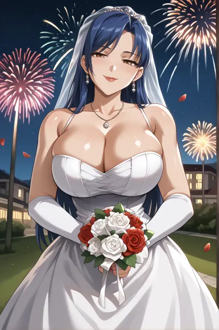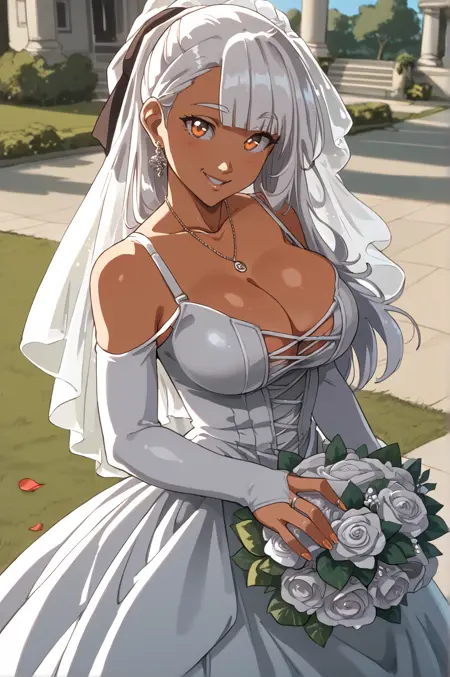 white dress, necklace, earrings, wedding dress, cleavage, bride, rose petals, long dress, holding, bare shoulders, bouquet, holding bouquet, white veil, bridal gauntlets, bridal veil, white capelet, wedding ring