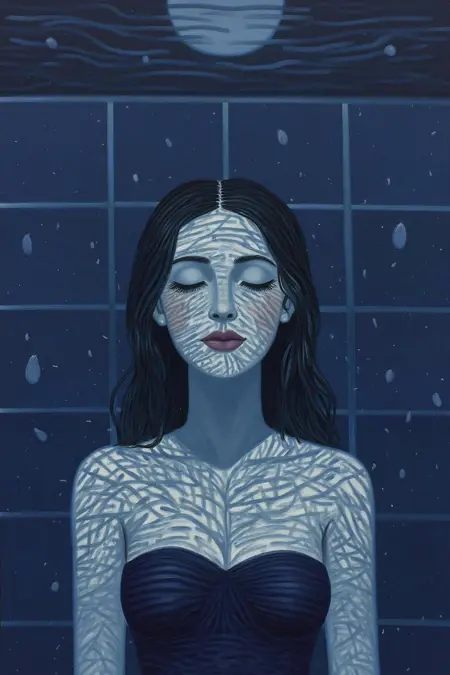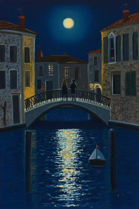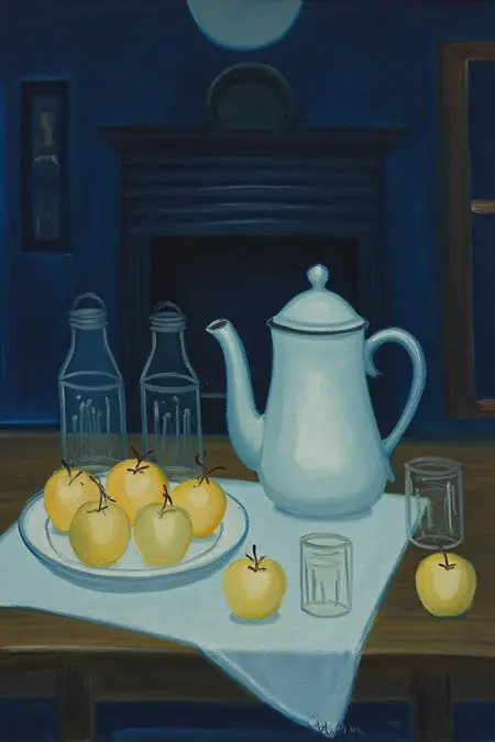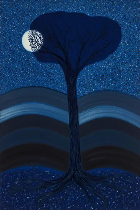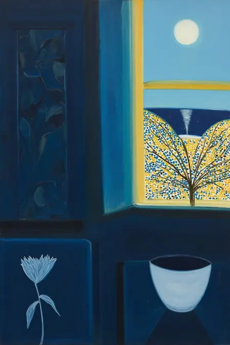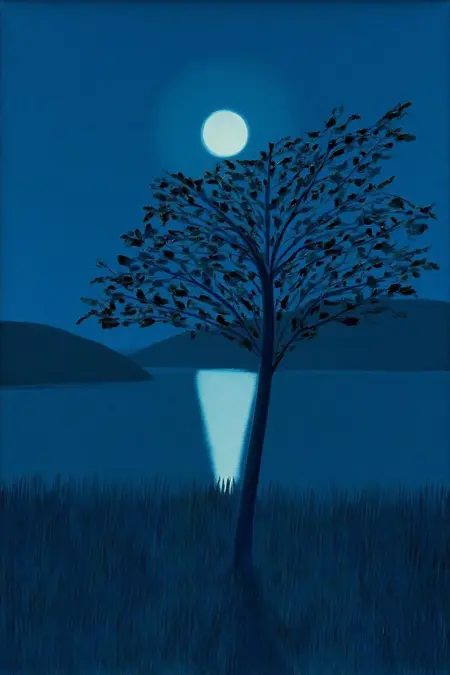 - A poetic depiction of a moonlit scene rendered in luminous shades of blue, capturing a sense of tranquility and longing.