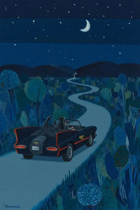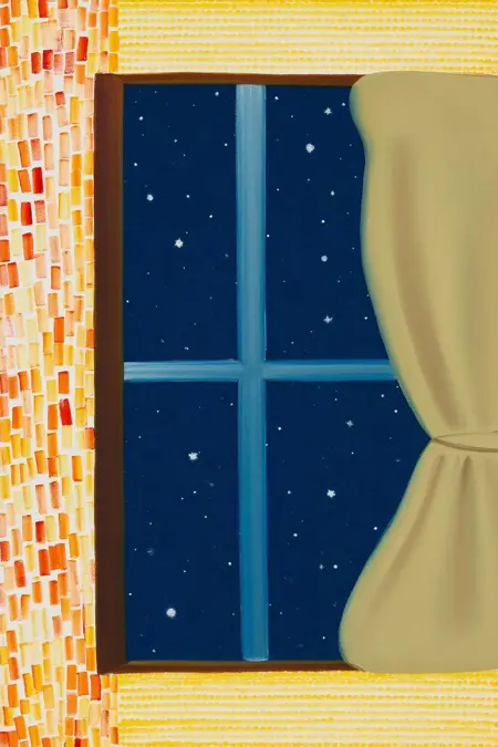 - A haunting nocturnal landscape featuring a solitary figure beneath a starry sky, showcasing Wong’s ability to blend stillness with emotional depth.
