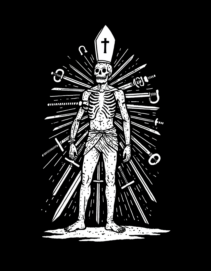 暗いローブをまとった骨格のキャラクターが、ターコイズ色の鎌を手に持ち、控えめな茶色の背景に配置されたグラフィックデザイン。ローブにはヴィンテージ風のブロックフォントで太字の"It's Time"と表示されたjon-continoスタイル