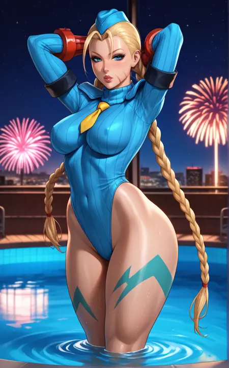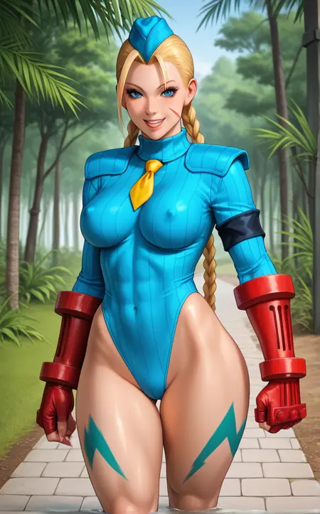 BlueBodysuit_Cammy_ownwaifu, 1girl, blonde hair, blue leotard, cammy white, scar on face, twin braids, hat, garrison cap, braid, ribbed leotard, blue eyes, fingerless gloves, long hair, highleg leotard, antenna hair, bracer, scar, shoulder pads, red gloves, armband, thong leotard, turtleneck, blue headwear, lips, bodypaint, scar on cheek, yellow necktie, large breasts, thighs, nose, camouflage, long sleeves, turtleneck leotard, short necktie, thick thighs, twintails, long braid, gauntlets, gloves, toned, wide hips, hair between eyes, jewelry, makeup, narrow waist, eyelashes, hair pulled back, impossible leotard, bare legs, body writing, lipstick, skin tight, tattoo,
