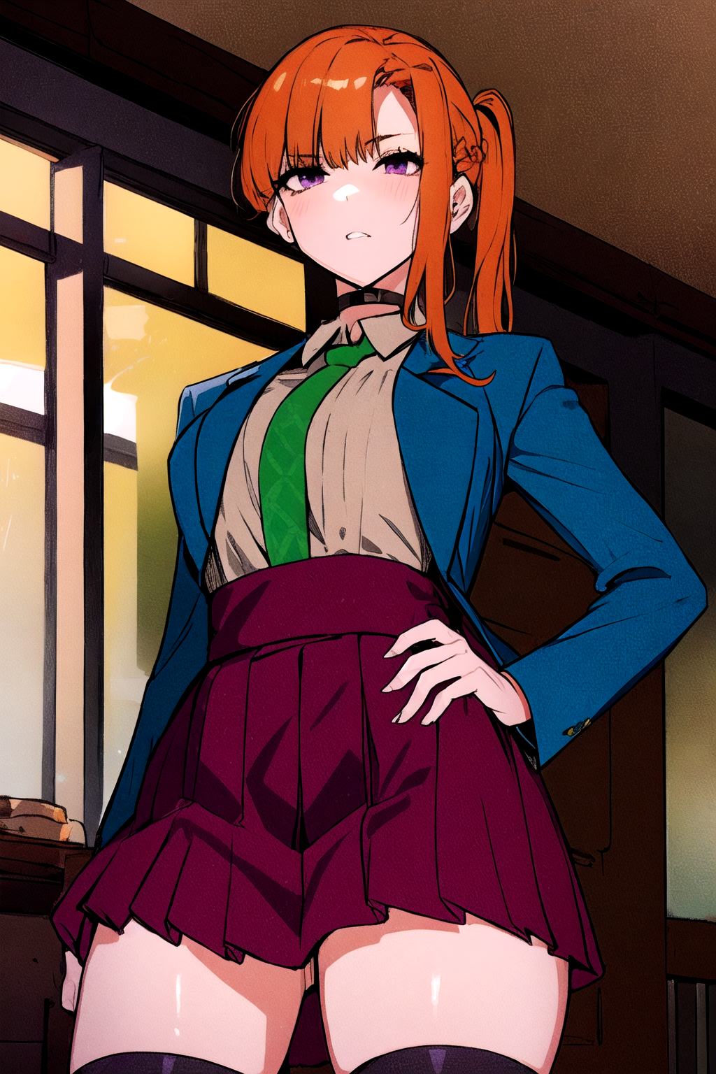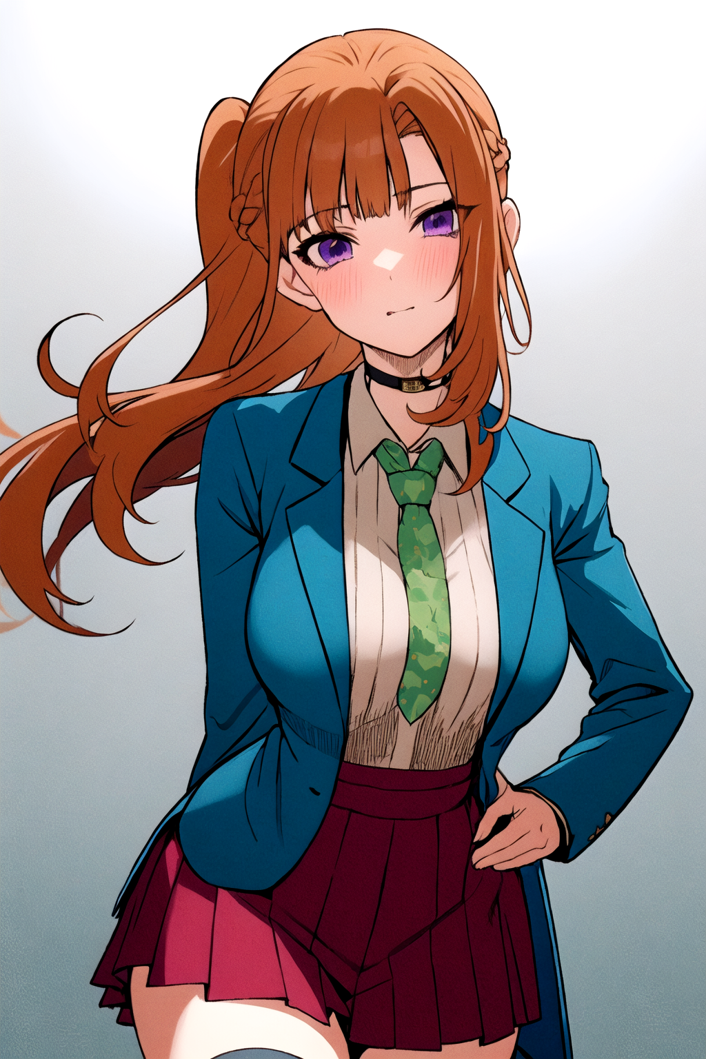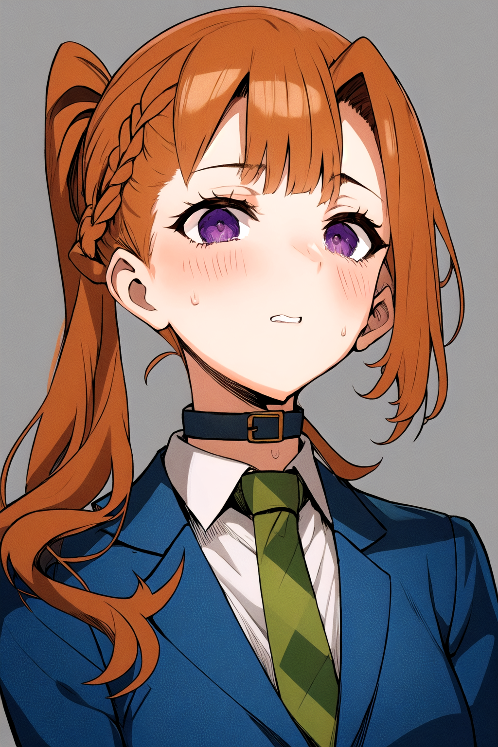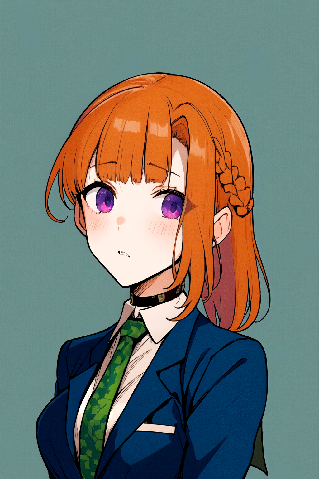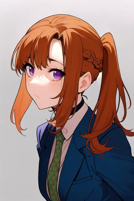 她的基础外观:刘海,校服,紫色眼睛,夹克,领带,有领衬衫,橙色头发,蓝色夹克,绿色领带,项圈。