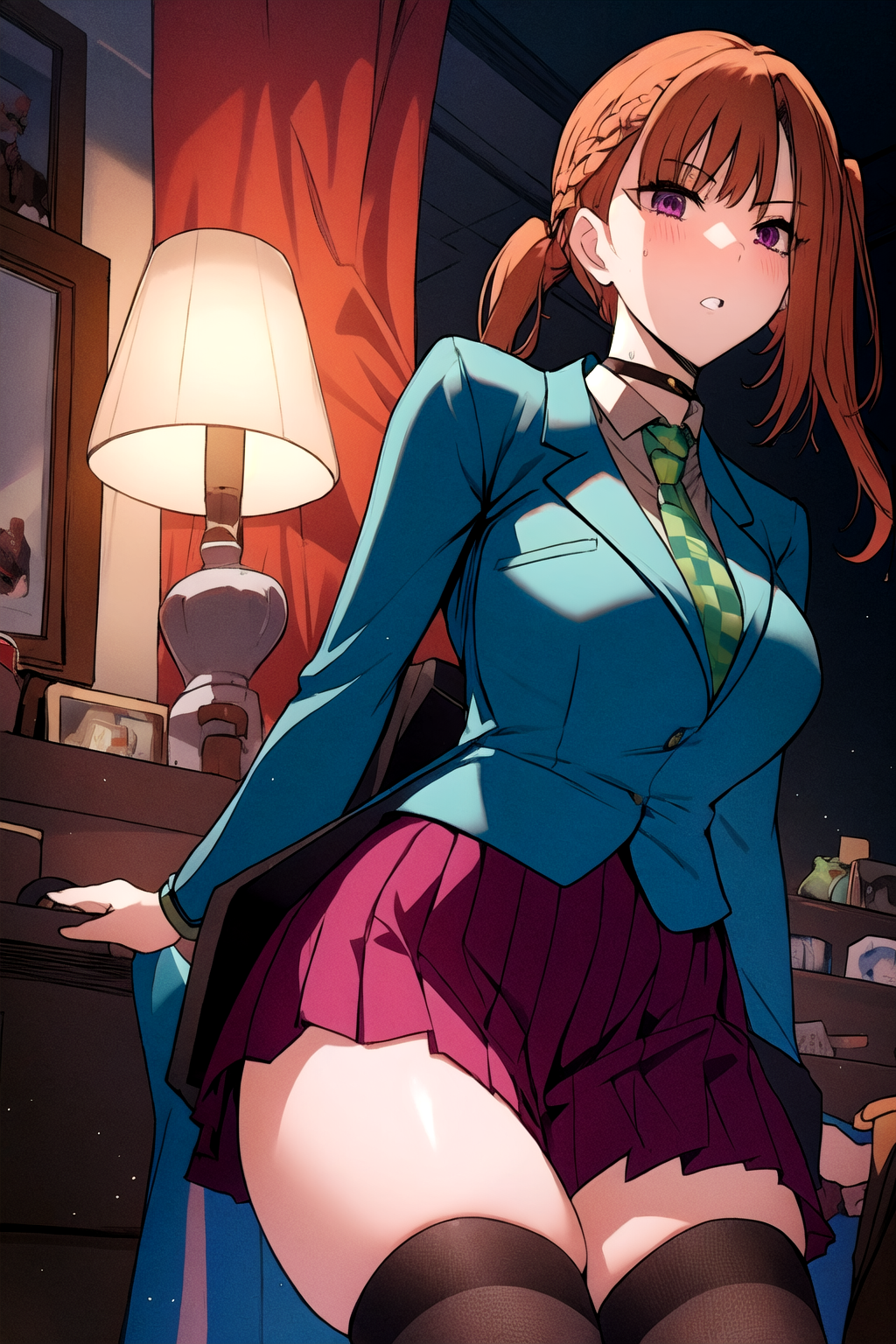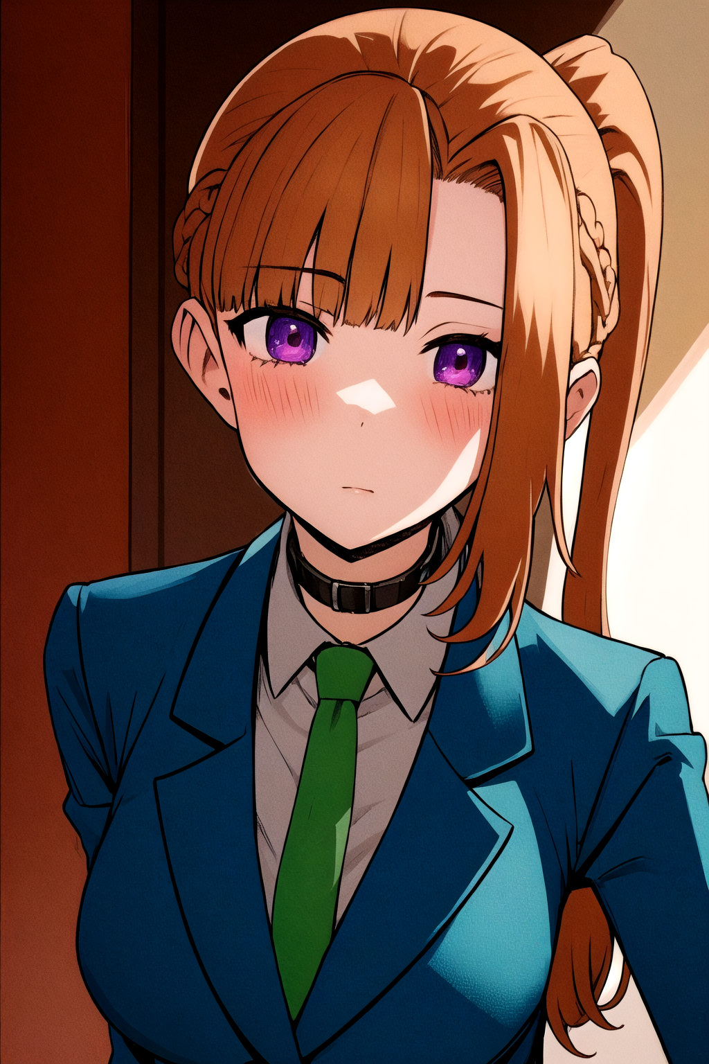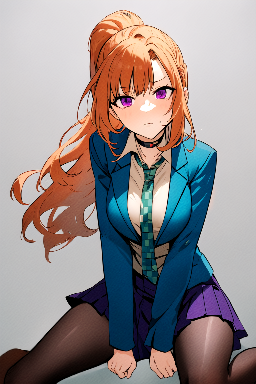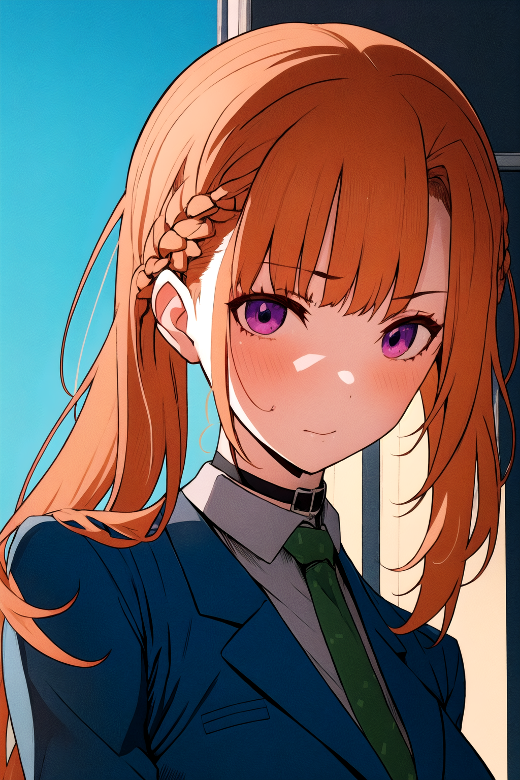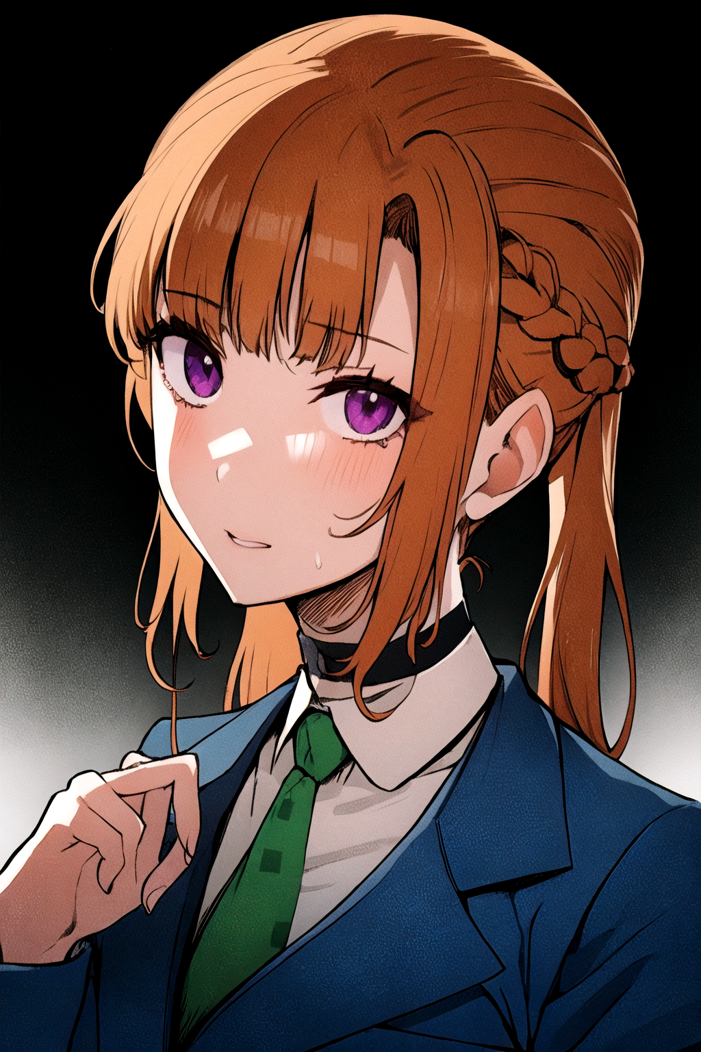 她的基础外观:刘海,校服,紫色眼睛,夹克,领带,有领衬衫,橙色头发,蓝色夹克,绿色领带,项圈。