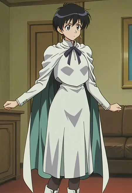 Meryl Stryfe: 1girl,solo,meryls,black hair,short hair,shirt,cape,ribbon,long sleeves,long skirt,pantyhose,boots