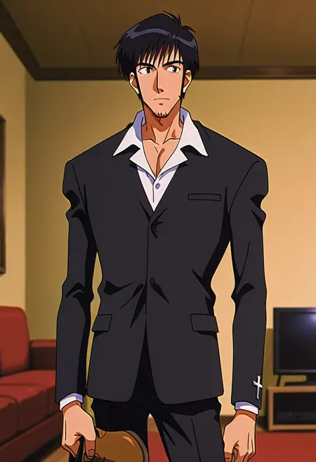 Nicholas D. Wolfwood: 1boy,solo,nicholasdw,facial hair,black hair,short hair,bangs,formal,suit,cross,white shirt,collared shirt,brown footwear,shoes