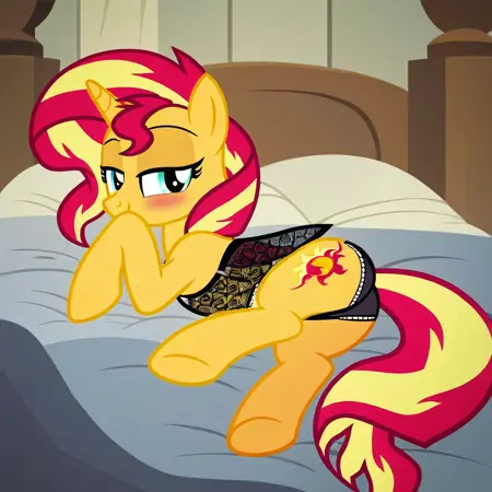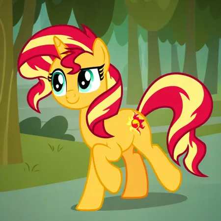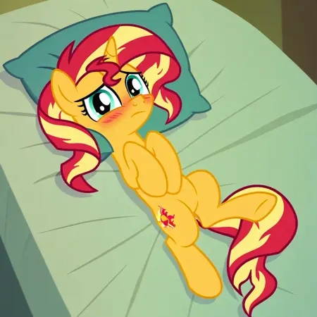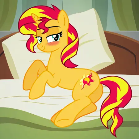 sunset shimmer, my little pony, multicolored hair, red hair, blonde hair, wavy hair, multicolored tail, red tail, blonde tail, cyan eyes, light amber skin, furry, mark on hip, horn,