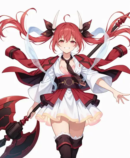 Kotorihybrid, frx_jacket, hyb_dress, frx_necktie, ifrit_hair_ribbon, hyb_sash, frx_thigh_boots, frx_skirt,ifrit_shawl, ifrit_axe, polearm,huge weapon