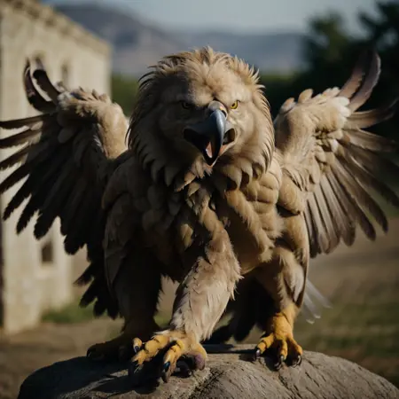 beak, blurry, blurry background, claws, depth of field, fangs, feathered wings, feathers, full body, griffon, long range, looking at viewer, open mouth, paw up, realistic, red eyes, solo, standing, tail, talons, tongue, wings, yellow eyes