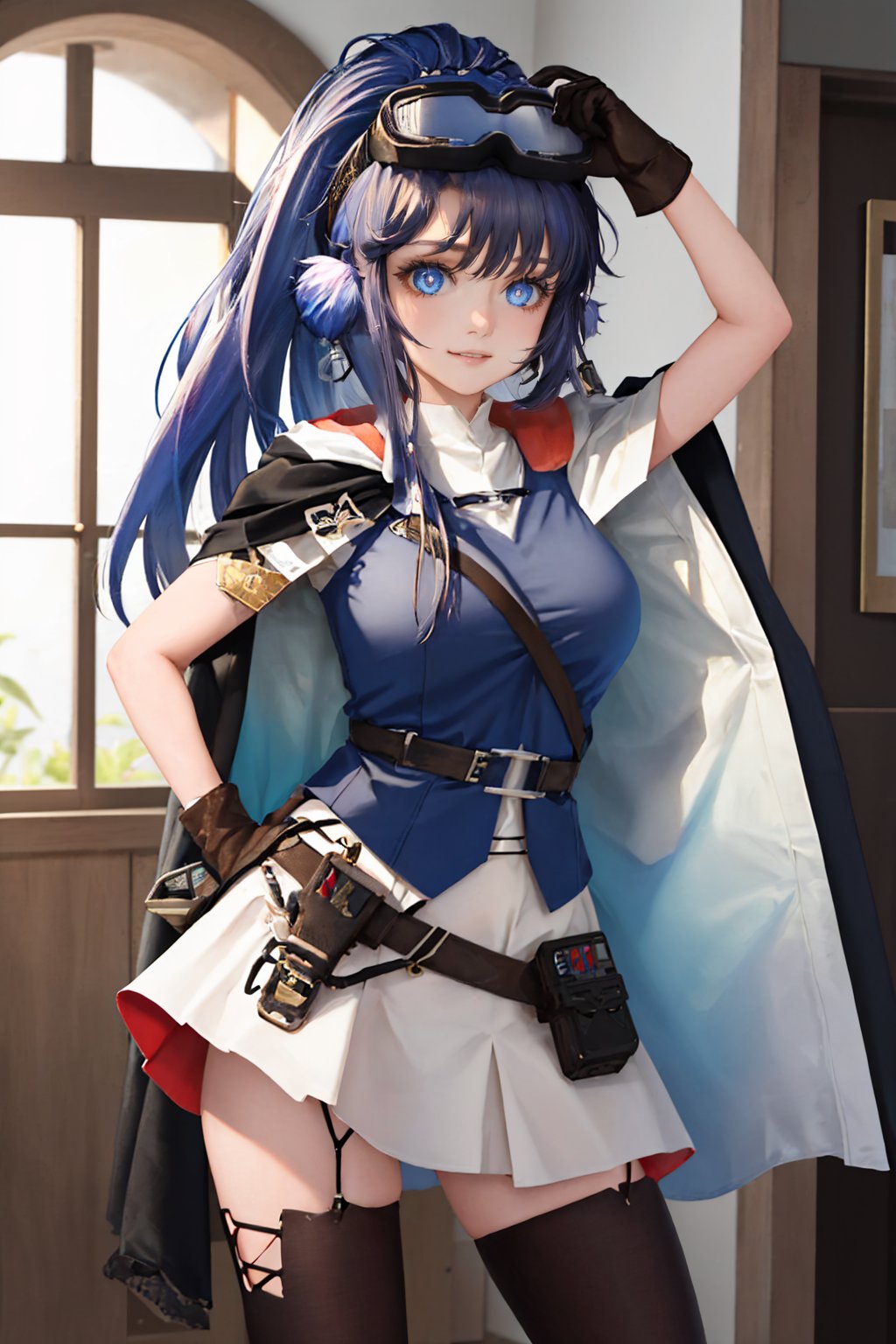 デフォルトの服装: 頭にゴーグル、青いシャツ、マント、白いスカート、太ももハイズ、ブーツ、黒い手袋