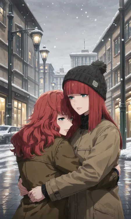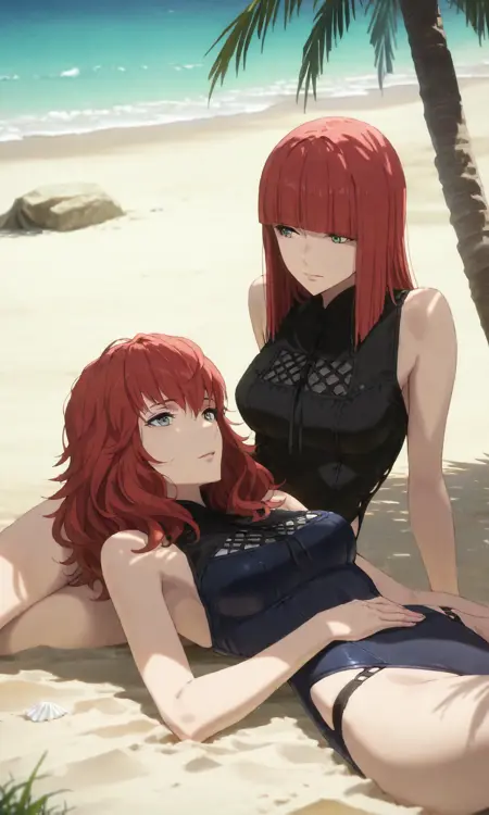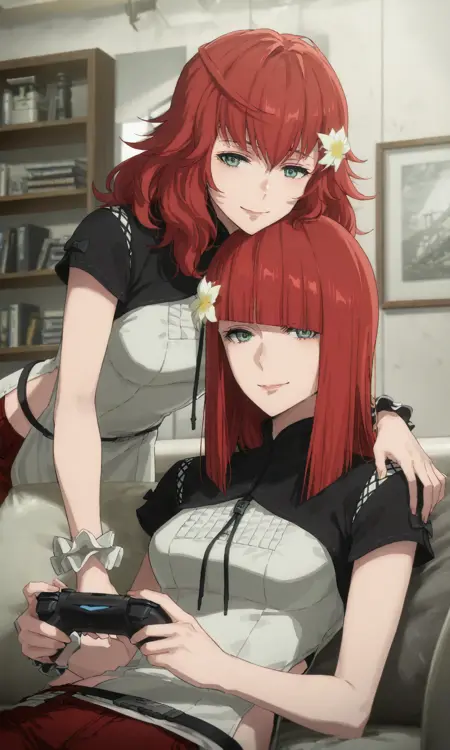 2girls, devolamv, wavy hair, popolamv, straight hair, green eyes, red hair, long hair, hair flower, white flower,