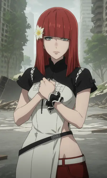 popolamv, 1girl, solo, green eyes, red hair, straight hair, long hair, hair flower, white flower,