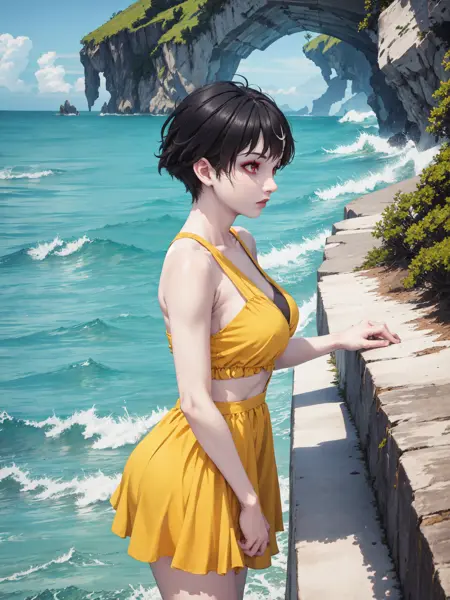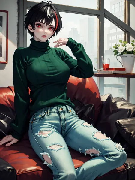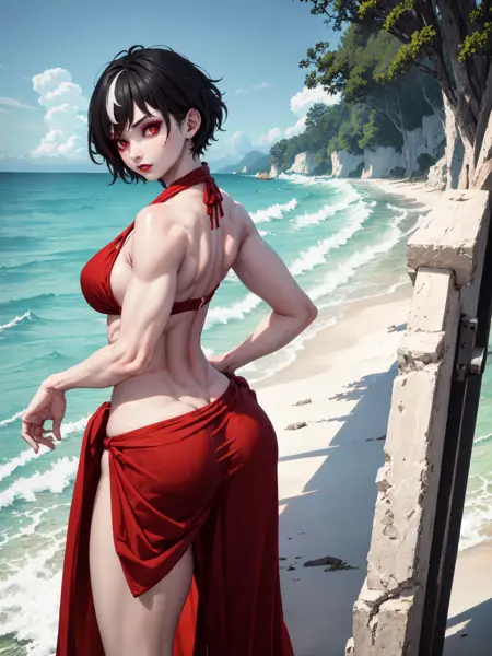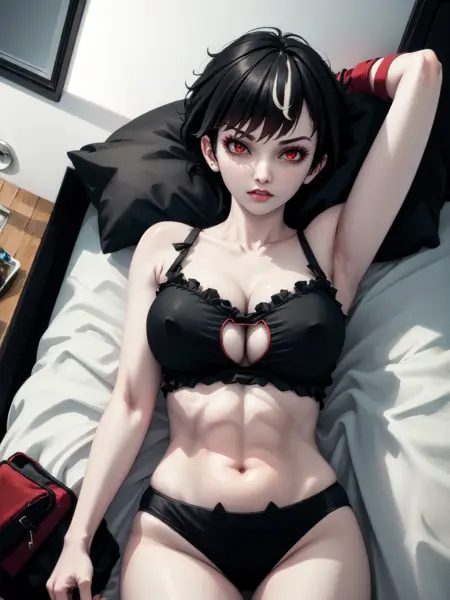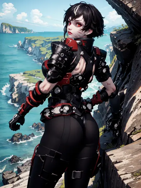 トリガー: "btsub, red eyes, pale skin, black hair, short hair" は常に必要。低ウェイトで一貫性を保つには "scar across eye, makeup, streaked hair, large breasts" も追加してください。