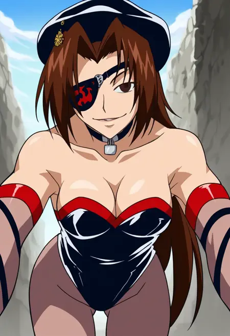 c4ndic3MT, brown hair, long hair, hat, eyepatch, brown eyes, choker