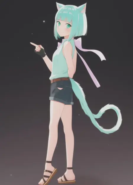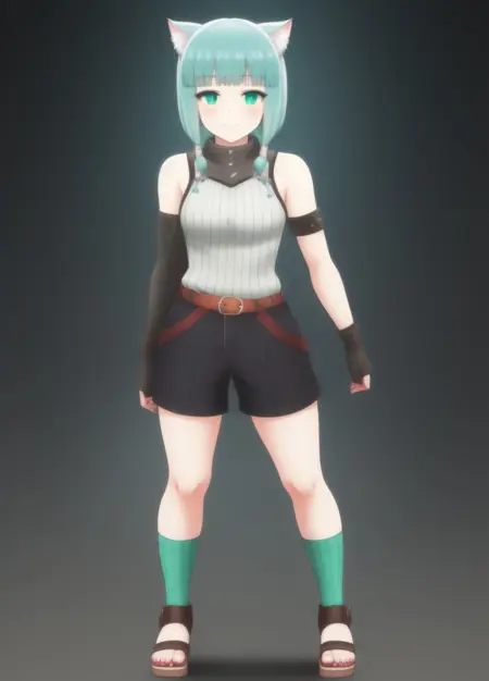 シロネコ、1girl、動物の耳、水色の目、水色の髪、肩出し、ベルト、黒背景、ストレートな前髪、頬染め、猫の耳、猫娘、猫の尾、口を閉じた、指なし手袋、全身、手袋、緑の目、観察者を見つめる、サンダル、短い髪、短いショートパンツ、ショートパンツ、ノースリーブ、笑顔、一人、立ち姿、尾、足趾露出