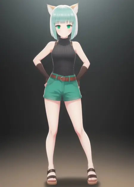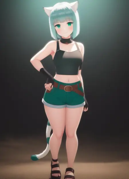 시로네코, 1girl, 동물 귀, 청록색 눈, 청록색 머리카락, 어깨 노출, 벨트, 검은 배경, 곧은 앞머리, 뺨에 홍조, 고양이 귀, 고양이 소녀, 고양이 꼬리, 입 다문 상태, 손가락 없는 장갑, 전체 몸, 장갑, 녹색 눈, 시청자 바라보기, 샌들, 단발, 짧은 반바지, 반바지, 팔 없음, 미소, 혼자, 서 있는 자세, 꼬리, 발가락 없는 신발