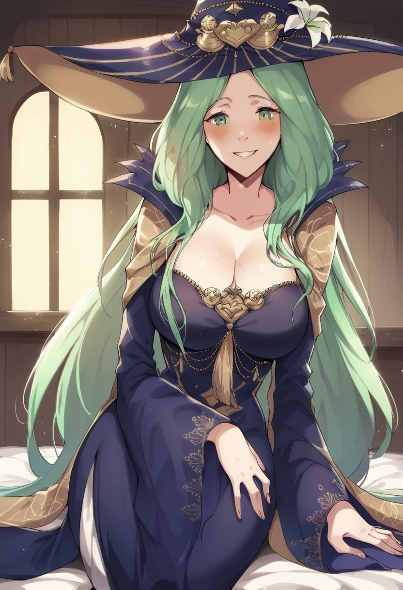 RheaHalloween, witch hat, long hair, green hair, green eyes, blue dress, witch dress, wide sleeves, large breasts,