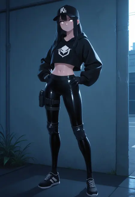 cropped hoodie, black hoodie, hood down, black gloves, baseball cap, black pants, sneakers, knee pads, thigh holster, handgun,