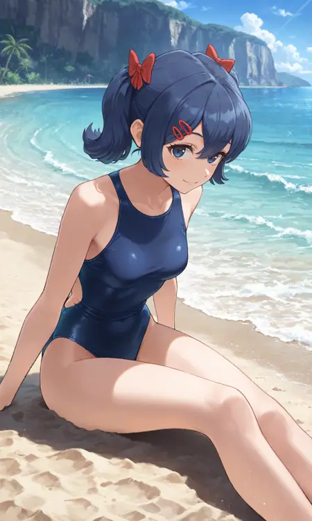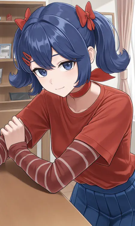 2dmita, 1girl, solo, blue eyes, blue hair, short twintails, medium hair, red bow, hair bow, hairclip,