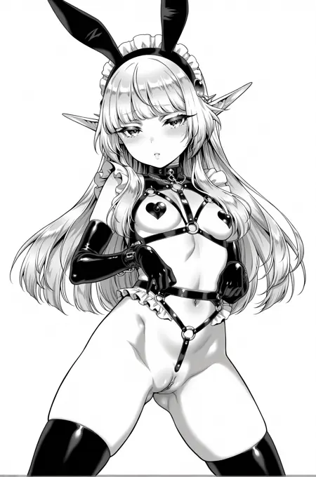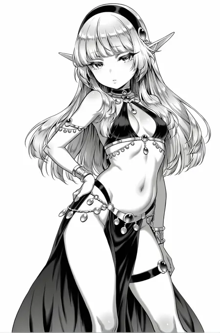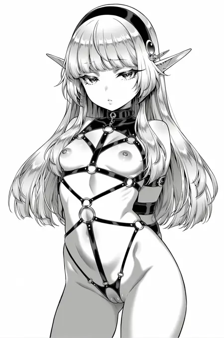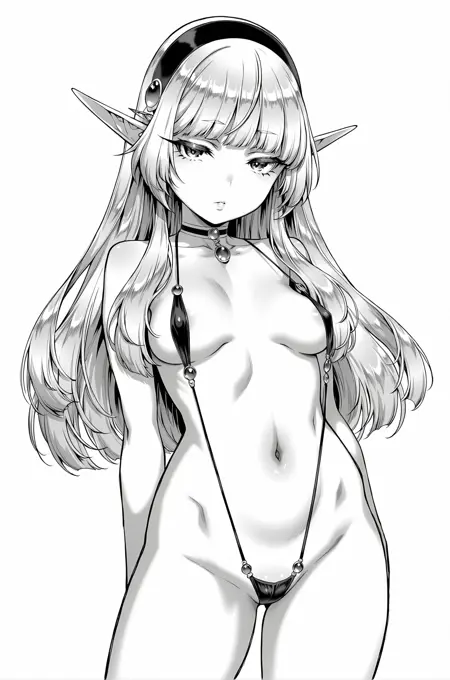 yuukyuunoshouElf1, monochrome, greyscale, elf, pointy ears, long hair, blunt bangs, hairband, small breasts