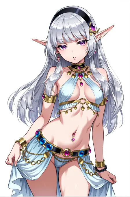 yuukyuunoshouElf1, elf, pointy ears, long hair, silver hair, blunt bangs, purple eyes, hairband, small breasts
