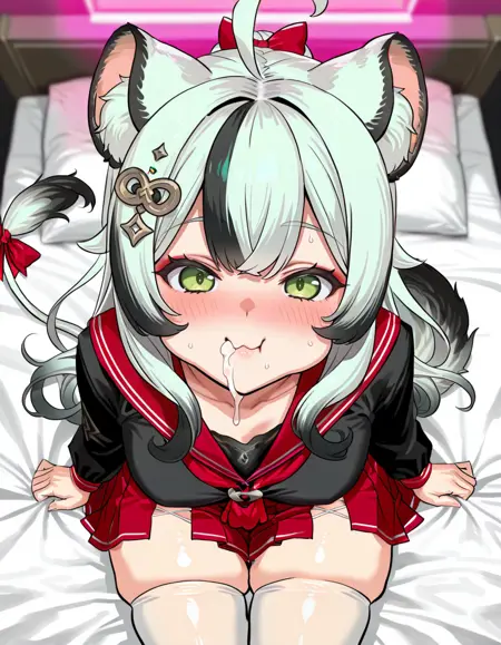 의상이 포함되지 않은 프롬프트: baki1126, 1girl, animal ears, tail, green eyes, multicolored hair, bow, tail ornament, black hair, long hair, virtual youtuber, hair ornament, animal ear fluff, red bow, tail bow, hair between eyes, grey hair, ahoge, hair bow, white hair, streaked hair, gradient hair,