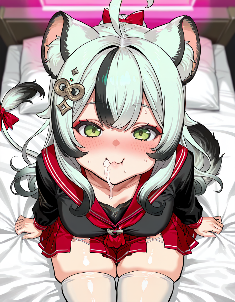 baki1126, 1girl, animal ears, tail, skirt, thighhighs, green eyes, solo, white thighhighs, red skirt, multicolored hair, bow, tail ornament, long sleeves, black hair, blush, school uniform, long hair, pleated skirt, serafuku, sailor collar, virtual youtuber, hair ornament, shirt, animal ear fluff, red bow, tail bow, black shirt, breasts, hair between eyes, neckerchief, grey hair, ahoge, hair bow, skindentation, white hair, streaked hair, gradient hair,