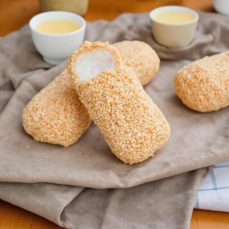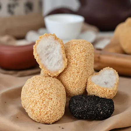 蔴老(Má Lǎo) は、もち米粉を使ったお菓子で、外側にごまをまぶした香ばしい香りと柔らかな食感が特徴です。お祭りや特別なイベントで人気があります。