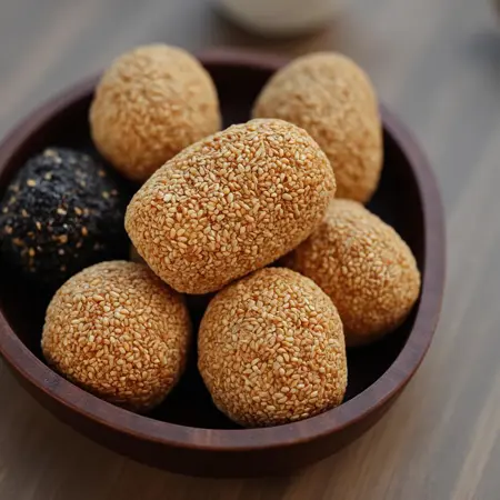 麻老 是一种裹满芝麻的糯米糕,质地柔软有嚼劲, toasted 芝麻散发出浓郁坚果香气,深受节日与庆典场合的喜爱。