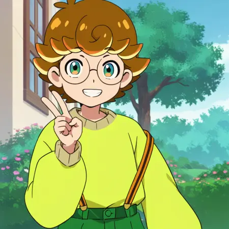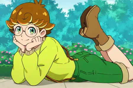 일반인: 남성, 다색 머리카락, 세 톤 머리카락, 스트라이프 머리카락, 갈색 머리카락, 노란색 머리카락 하이라이트, 주황색 머리카락 하이라이트, 녹색 눈, 안경, 노란 스웨터, 녹색 반바지, 스트랩, 흰색 양말(신발 없을 경우), 갈색 끈 없는 부츠, 실내(침실), 야외(도시), 야외(정원/생목/꽃)