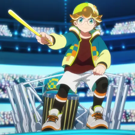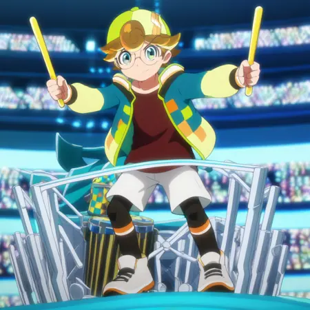 유니폼: 남성, 다색 머리카락, 세 톤 머리카락, 스트라이프 머리카락, 갈색 머리카락, 노란색 머리카락 하이라이트, 주황색 머리카락 하라이트, 녹색 눈, 안경, 야구 모자, 뒤집어 쓴 모자, 재킷, 진한 빨간 셔츠, 흰색 반바지, 검정과 주황색 무릎 길이 양말, 신발, 들고 있음, 드럼 스틱, 양손 사용, 실내(경기장/무대/관중석)