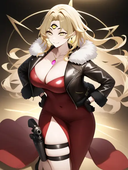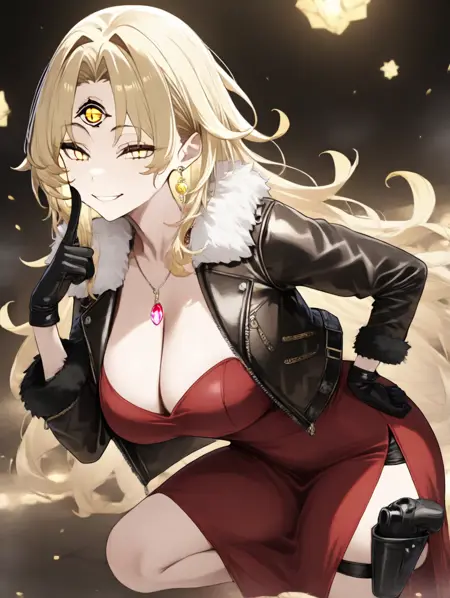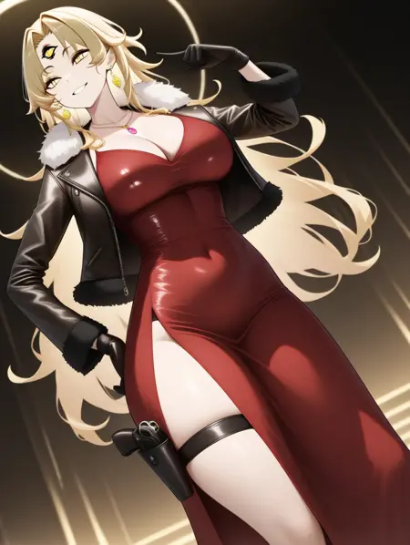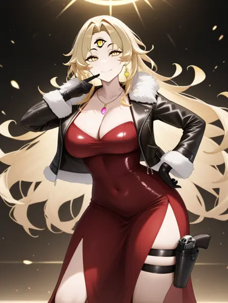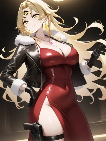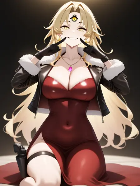 プロンプトの例: kouki,金髪,ロングヘア,余分な目,ファーのトリム,レザーのジャケット,赤いドレス,サイドスリット,手袋,ジュエリー,太ももホルスター,黄色い目,銃,ネックレス,太ももストラップ,ピアス,開いたジャケット,笑顔,